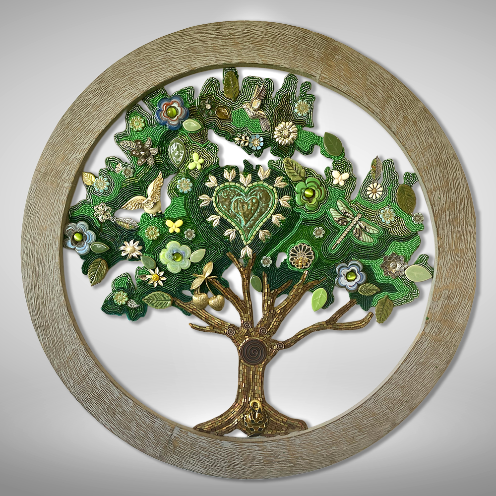"Using old jewelry, stones, tile, glass, beads, buttons, and other found objects, I build connections through color, shape, texture, and theme."
