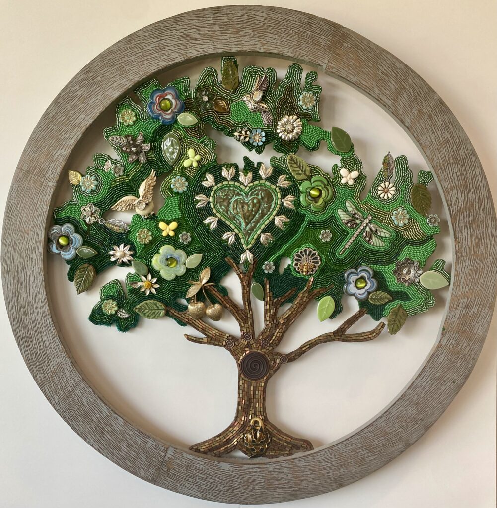 I didn’t have a set plan when I started this piece. I rarely do. What I had was a precut Tree of Life substrate and a collection of materials I’ve gathered over the years: beads, brooches, baubles . . . and flowers. So. Many. Flowers. At first, I imagined filling the entire canopy with blooms.