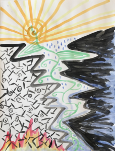 The brush keeps moving. Bruises rise in black and blue, like mountains too tired to stand any longer. Parched, cracked earth mutates into broken bones. The ravaged multitudes cry enough! no more! as flames of collapse and destruction blaze hotter and higher.